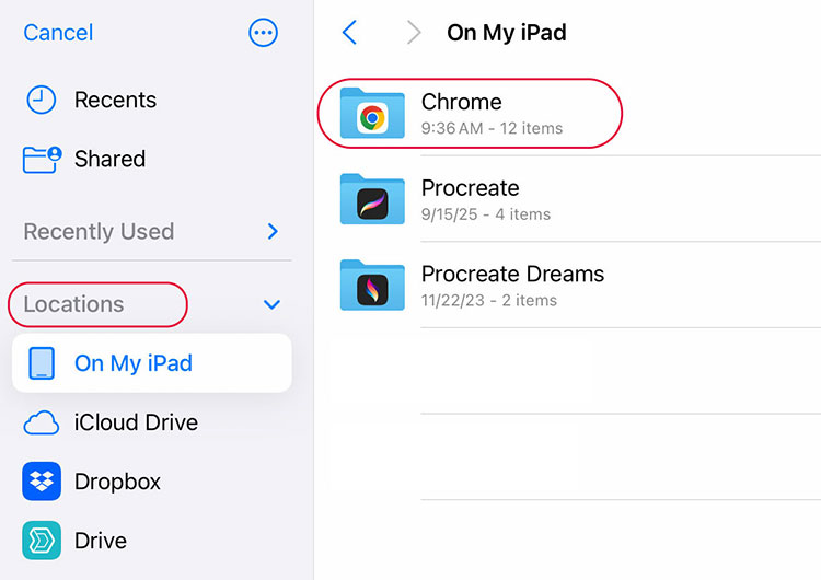 Option A: If you downloaded the files directly to your iPad, under Locations, tap On My iPad, then tap the Chrome folder.